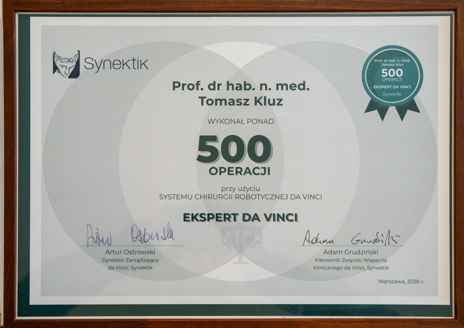 Uniwersytecki Szpital Kliniczny im. Fryderyka Chopina w Rzeszowie może pochwalić się kolejnym ważnym osiągnięciem. Prof. dr hab. n. med. Tomasz Kluz wykonał 500 operacji z wykorzystaniem systemu robotycznego da Vinci, co potwierdzono certyfikatem dokumentującym jego doświadczenie jako operatora oraz kompetencje całego zespołu.