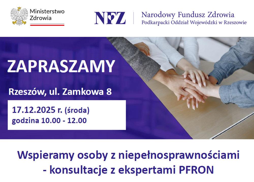 Pierwsze wydarzenie odbędzie się 17 grudnia w godzinach 10:00 – 12:00 w siedzibie Podkarpackiego Narodowego Funduszu Zdrowia przy ul. Zamkowej 8 w Rzeszowie. To spotkanie zostało przygotowane z myślą o osobach z niepełnosprawnościami oraz ich bliskich, którzy chcą lepiej orientować się w przysługujących im prawach i dostępnych formach pomocy.
