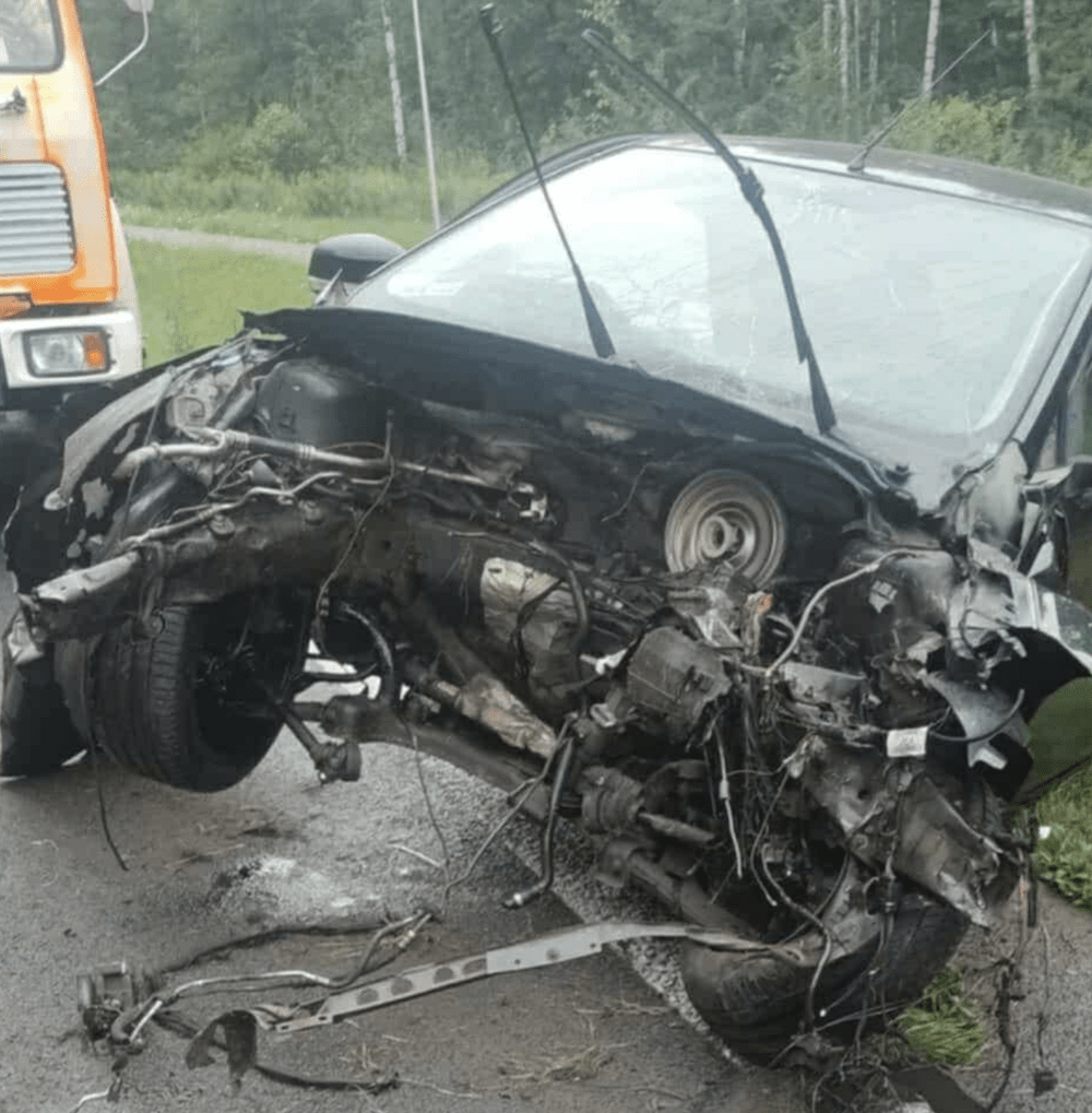 Jeden z pojazdów ma całkowicie zniszczony przód – wrak jest pozbawiony silnika, a części karoserii i elementy mechaniczne są rozrzucone na jezdni.