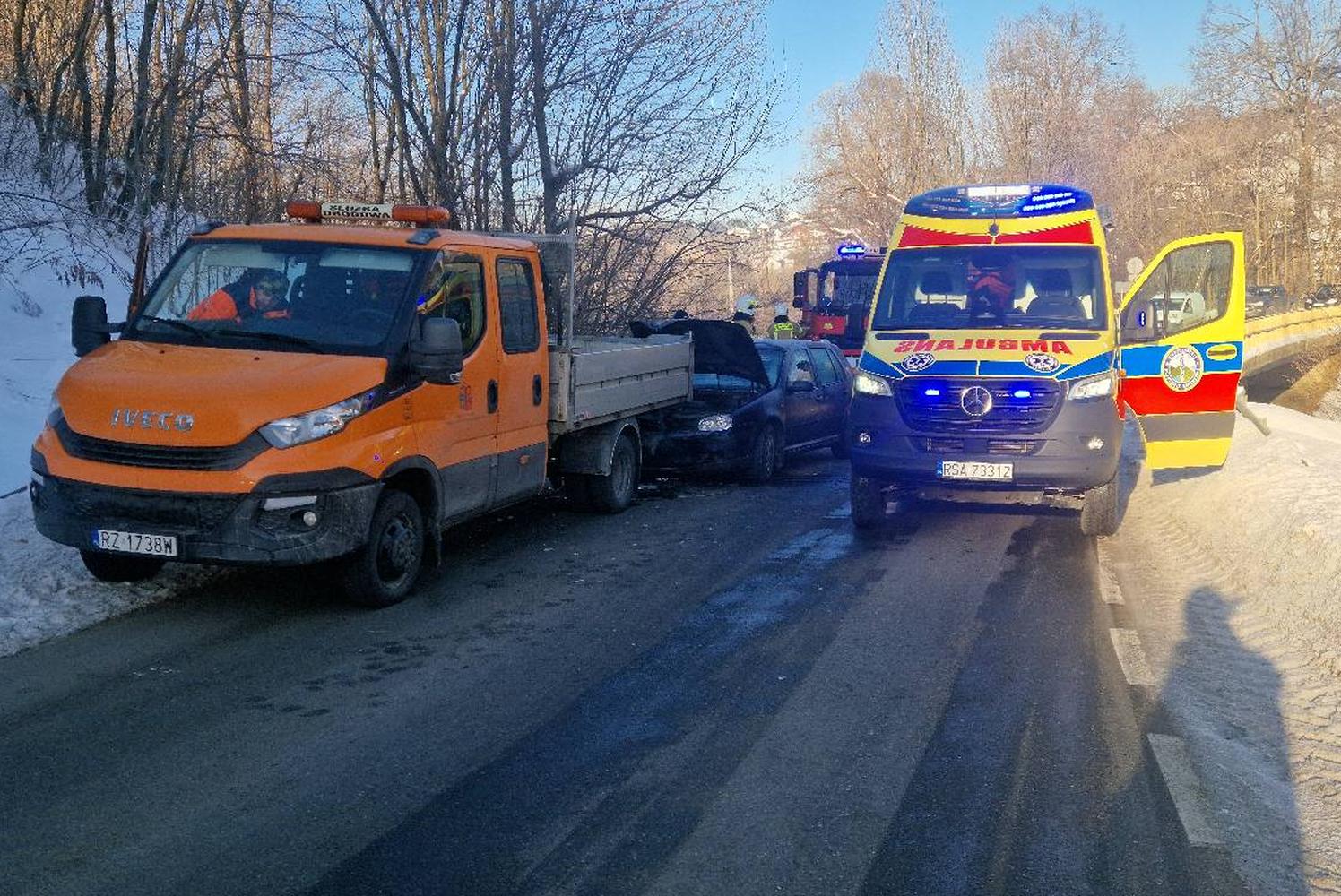 Do wypadku doszło we wtorek (20 stycznia), tuż przed godziną 9:00 rano, w miejscowości Wołkowyja. Według wstępnych ustaleń policjantów pracujących na miejscu, 36-letni kierowca volkswagena golfa w rejonie skrzyżowania nie zauważył zaparkowanego na poboczu drogi pojazdu służb porządkowych i uderzył w jego tył.