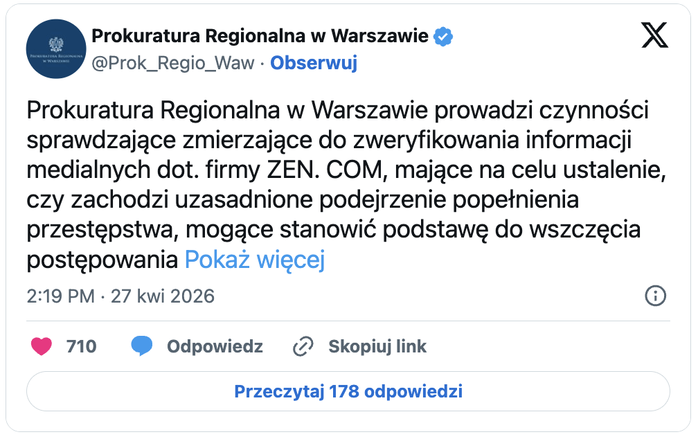 „Prokuratura Regionalna w Warszawie prowadzi czynności sprawdzające zmierzające do zweryfikowania informacji medialnych dot. firmy ZENCOM, mające na celu ustalenie, czy zachodzi uzasadnione podejrzenie popełnienia przestępstwa, mogące stanowić podstawę do wszczęcia postępowania przygotowawczego” – brzmi wpis prokuratury.
