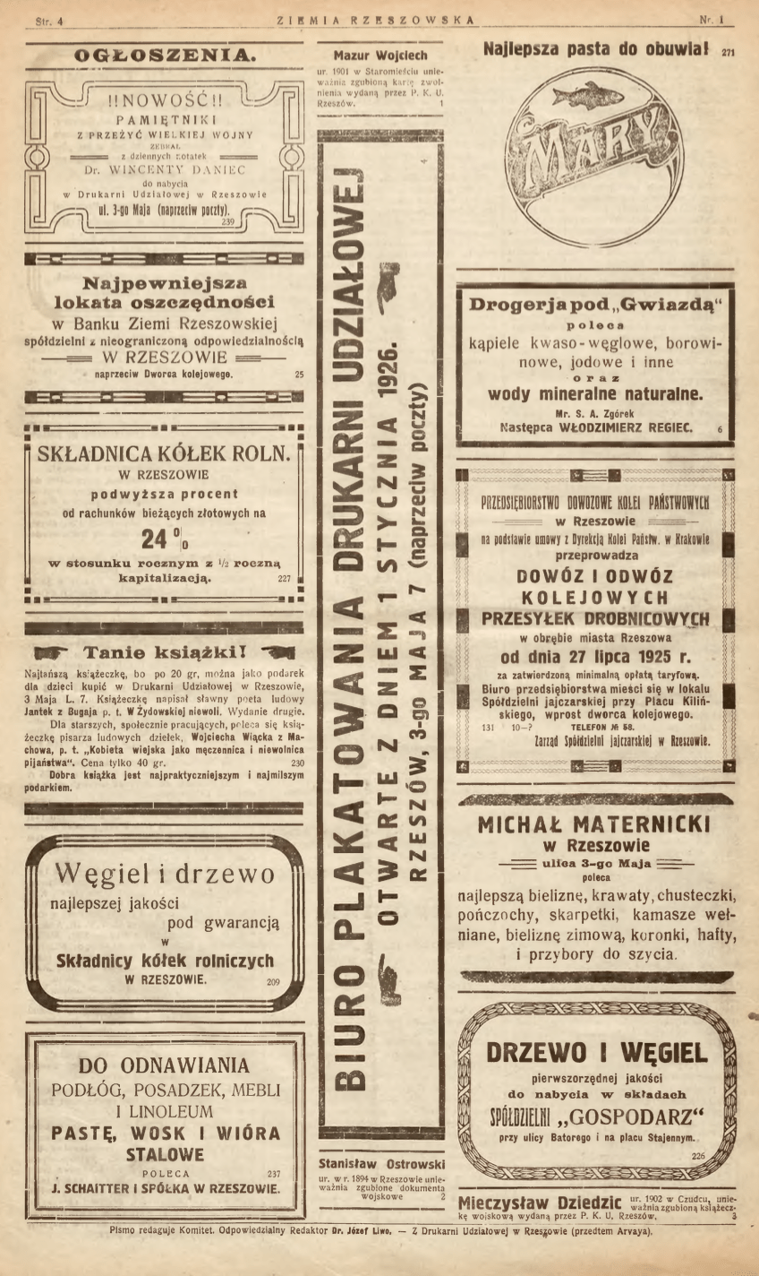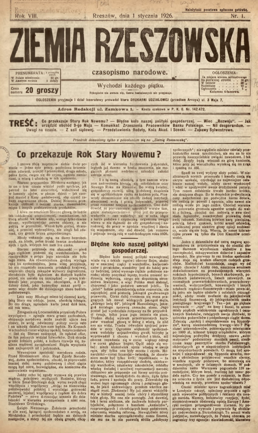 Dziennik „Ziemia Rzeszowska” swój pierwszy numer z roku 1926 zaczął od artykułu „Co przekazuje Rok Stary Nowemu?”, w którym napisano: „Starzec przypomina Młodemu następcy, jak to on o tym czasie widział puste spichrze, jak patrzał na letni nieurodzaj, wsłuchiwał się w lamenty ojców, w płacze dzieci, jak czerpać musiał z kasy państwowej, aby czynić zakupy zagranicznego zboża. Dzisiaj Nowemu przekazuje obfitość i taniość ziarna, ziemniaków, mięsa i innych podstawowych produktów. Młody wskazuje ręką na tłumy bezrobotnych, na blade, pełne troski twarze zredukowanych i tych, których ten sam los czeka”.