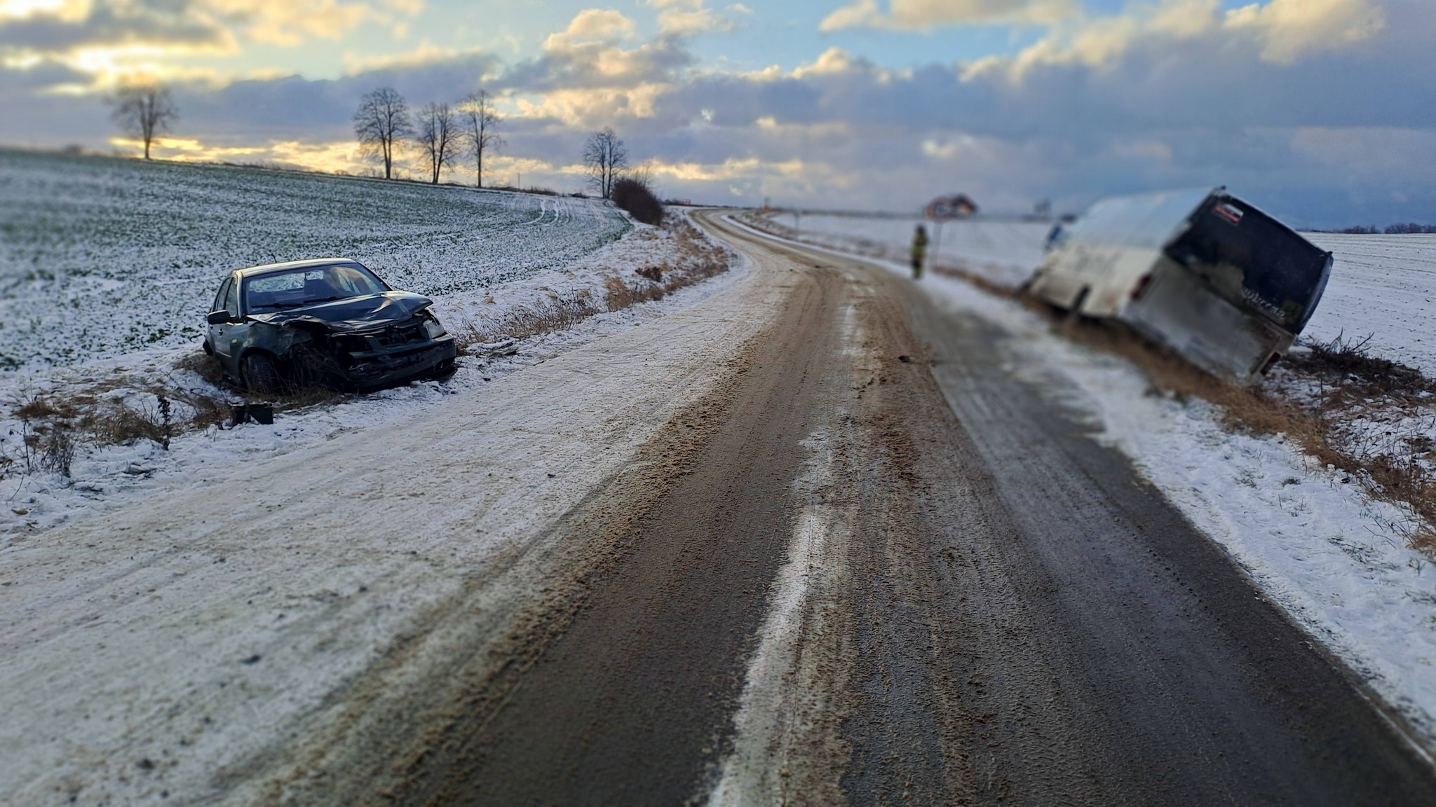 Zderzenie było na tyle gwałtowne, że oba pojazdy wypadły z drogi. Osobowy Volkswagen z mocno rozbitym przodem zatrzymał się w rowie, natomiast autobus wpadł do rowu i oparł się o krawędź rowu na prawej stronie. Wyciągnięcie pojazdu i naprawa będą kosztowne.