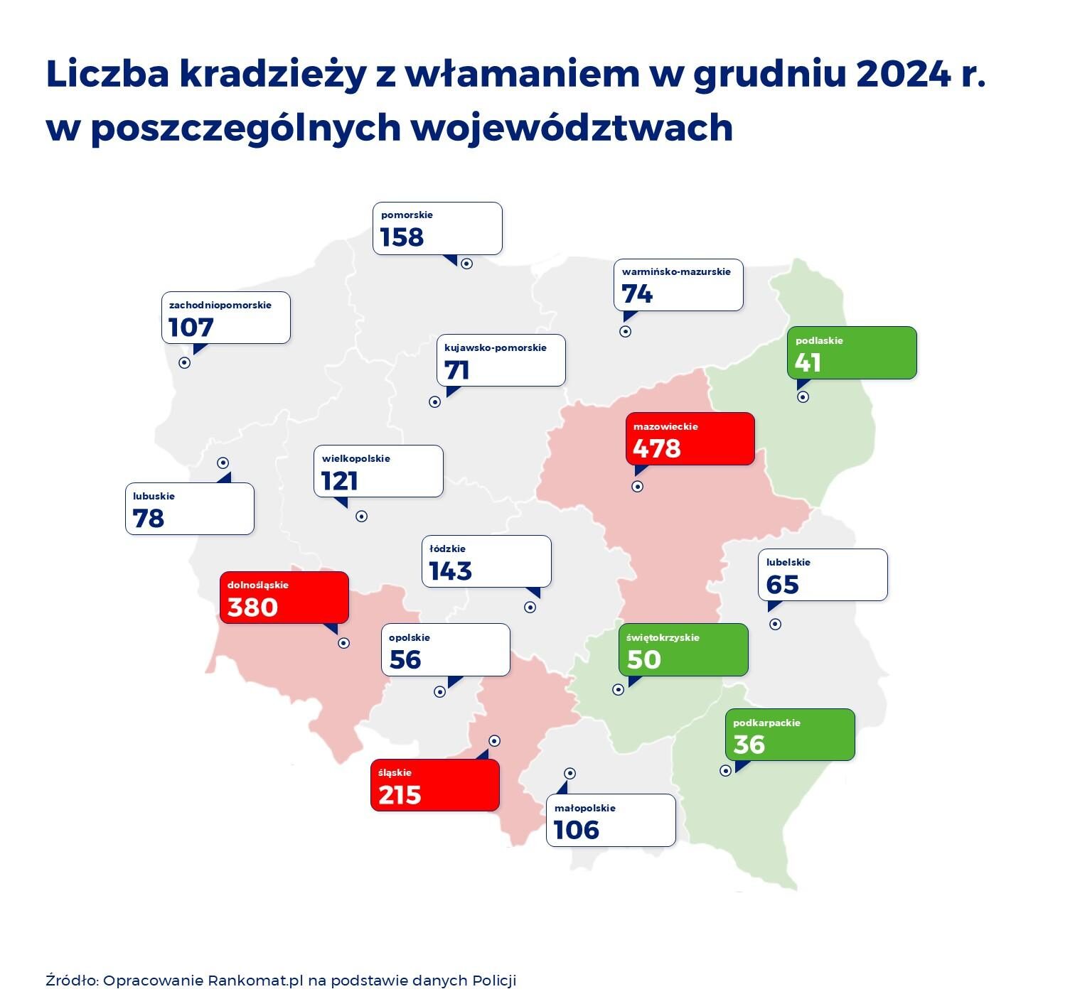 W samym 2024 roku ten kontrast był jeszcze bardziej widoczny. W sierpniu odnotowano “tylko” 827 włamań, zaś w grudniu aż 2179 włamań. To skok o blisko 163 proc. w skali całego kraju.
