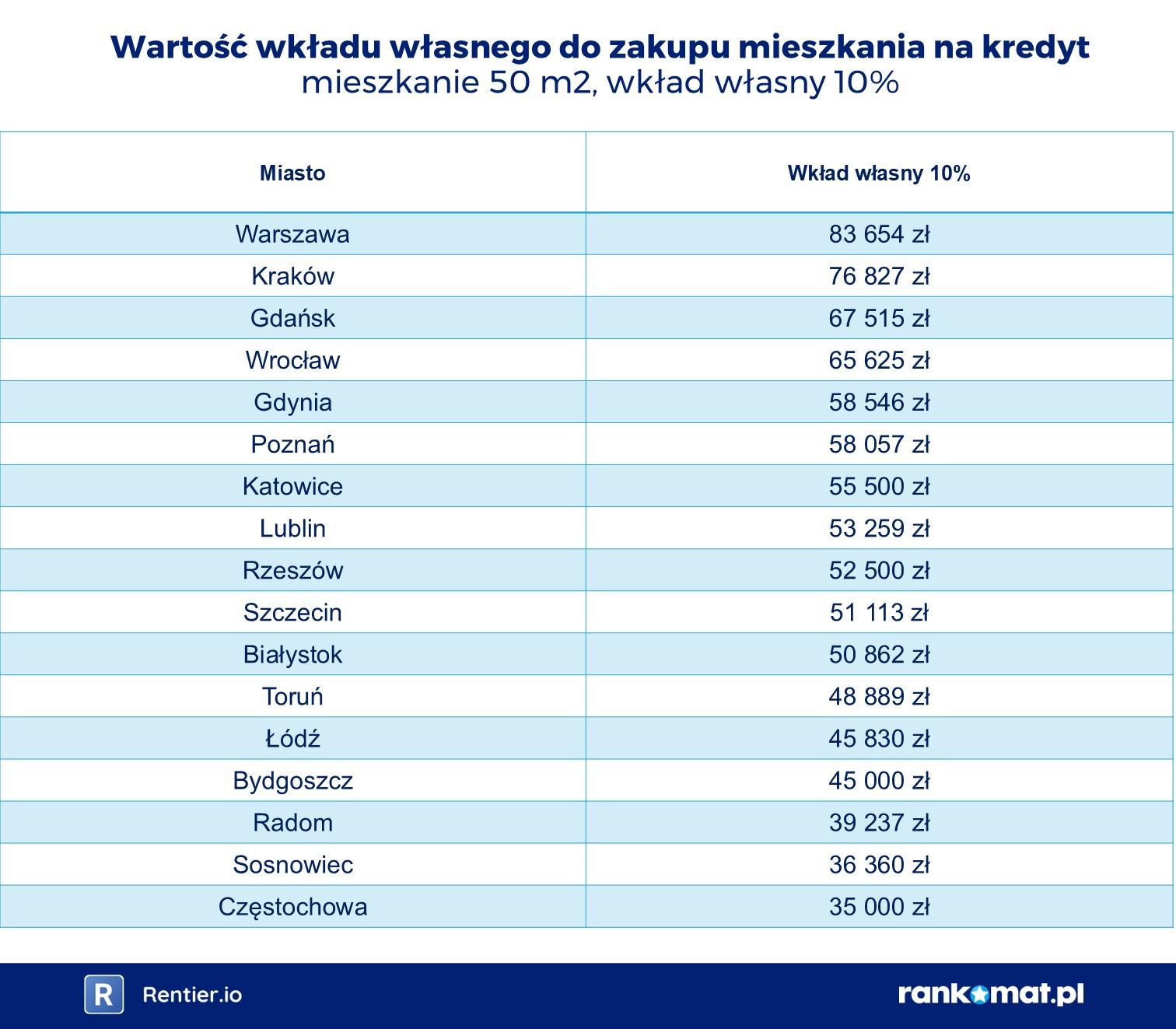 W Częstochowie na zakup mieszkania o powierzchni 50 m² w III kw. 2025 r. wystarczyło 35 tys. zł wkładu własnego. W Rzeszowie jest to już 52 500 zł, a w Warszawie i Krakowie – kolejno 83 654 zł i 76 827 zł.