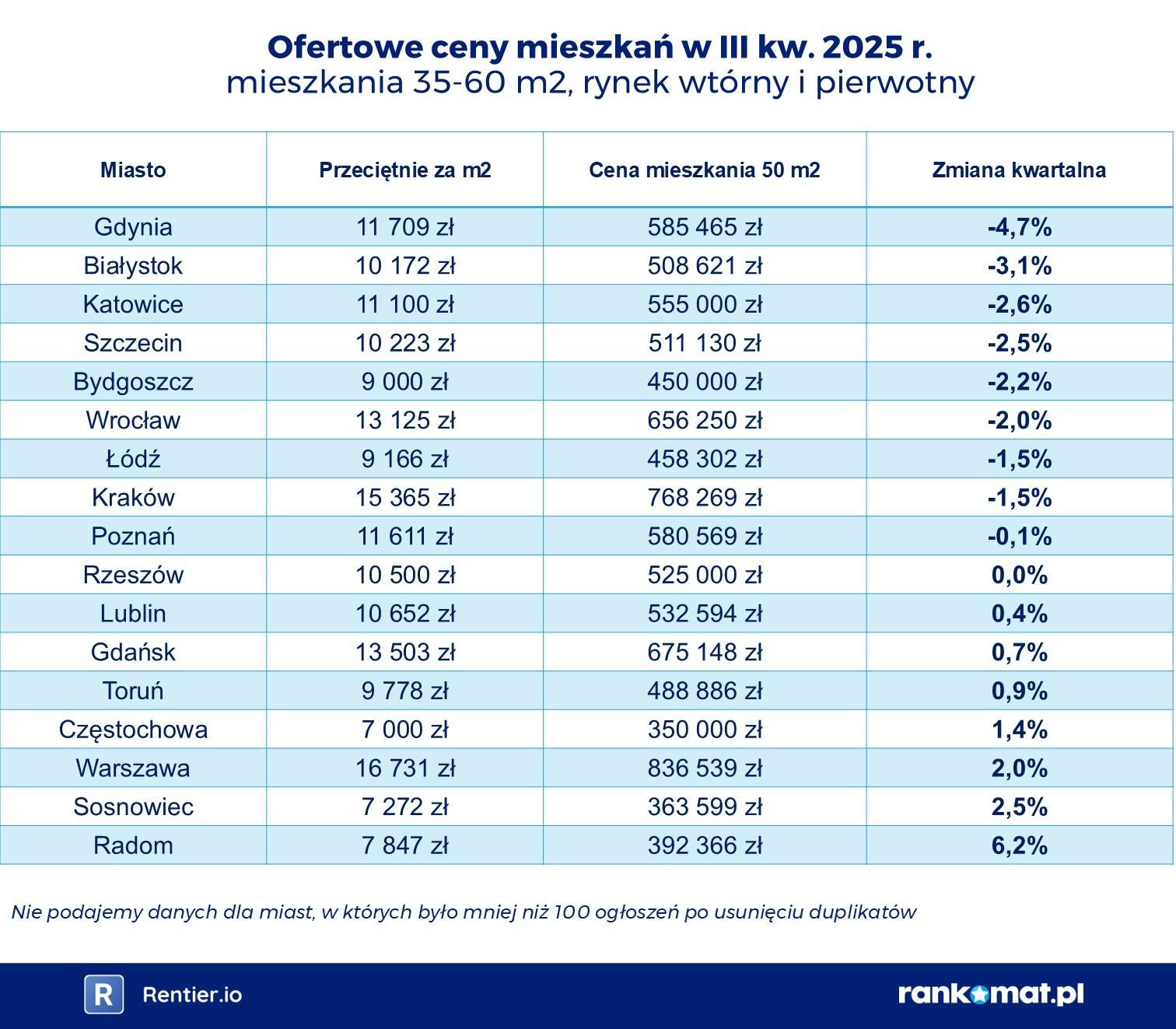 Według raportu Rankomat.pl i Rentier.io, w porównaniu z drugim kwartałem 2025 r., w 9 z 17 dużych miast w Polsce ceny średnich mieszkań potaniały.