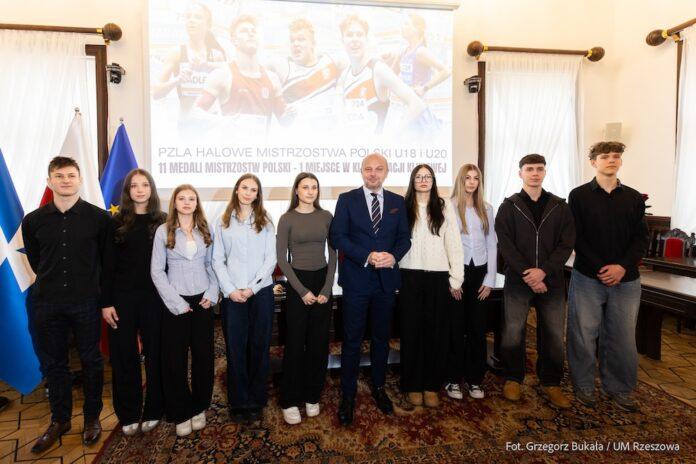 Zdjęcie: Grzegorz Bukała, UM Rzeszów; młodzi lekkoatleci (medaliści Mistrzostw Polski U18 i U20) i prezydent Rzeszowa