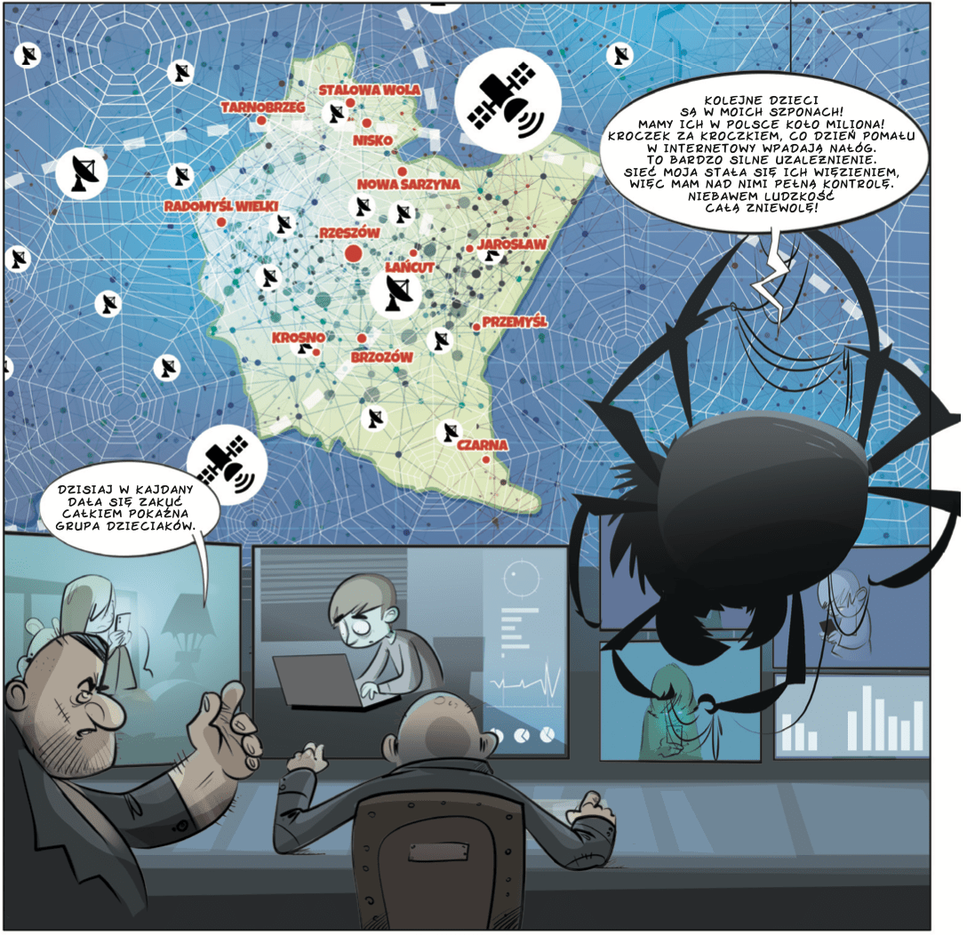 Fabuła komiksu autorstwa Jarosława Sieka i Mariusza Urbana przenosi czytelników w samo serce Podkarpacia. Złowrogi Okrutny Pająk (uosobienie cyfrowego nałogu i dezinformacji) oplata swoją siecią kolejne miasta, więżąc umysły dzieci przed ekranami.