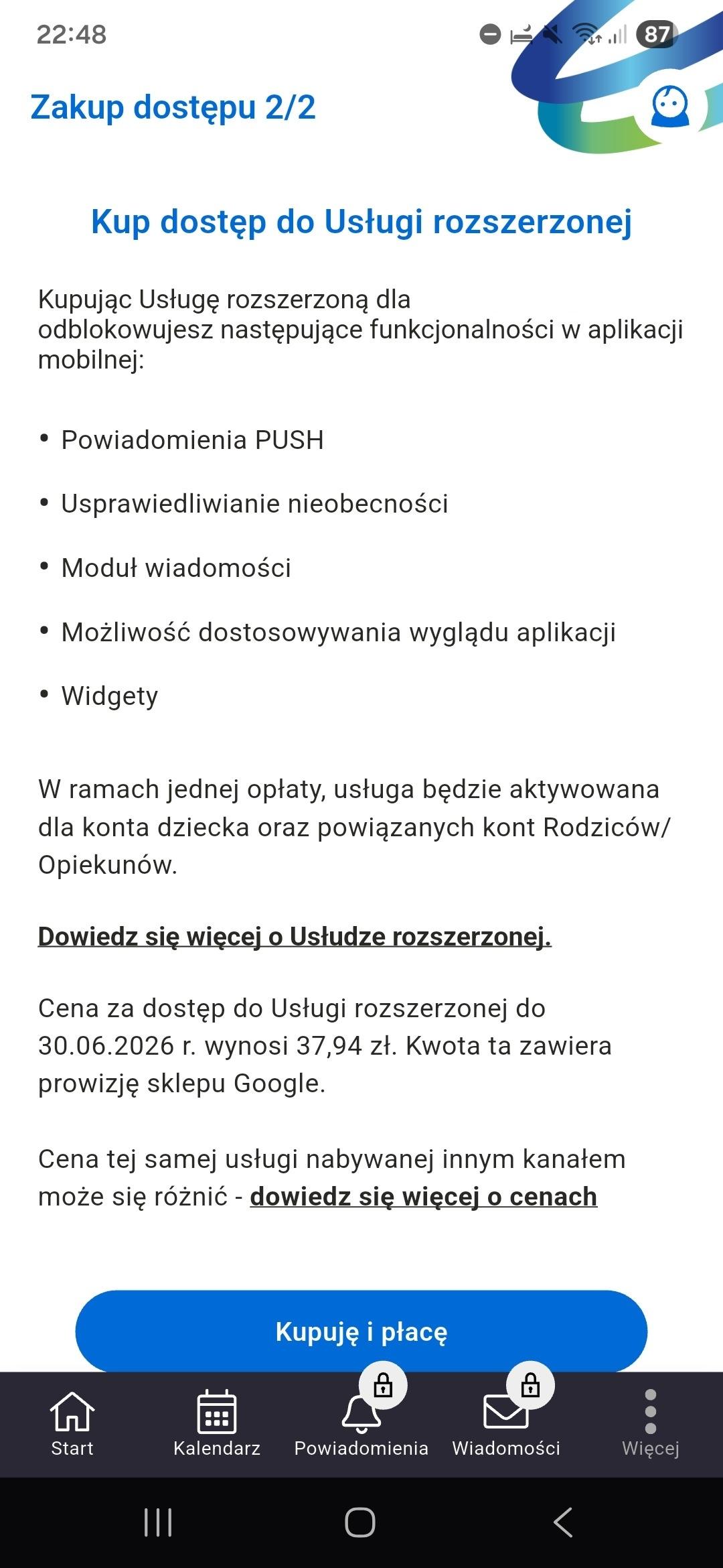 Problem dotyczy niemal każdego rodzica w stolicy Podkarpacia. Na przesłanych do naszej redakcji zrzutach ekranu wyraźnie widać ikony kłódek przy modułach „Wiadomości” oraz „Powiadomienia”. Aby je odblokować, aplikacja żąda opłaty w wysokości 37,94 zł za dostęp do końca czerwca 2026 roku.
