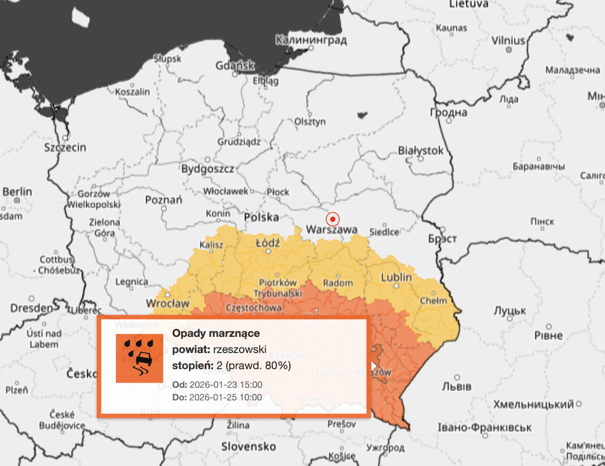 Sytuacja pogodowa w południowo-wschodniej Polsce uległa gwałtownemu pogorszeniu. IMGW wydał ostrzeżenia II stopnia przed marznącymi opadami powodującymi gołoledź, które obejmują m.in. całe województwo podkarpackie. Alerty obowiązują od piątkowego popołudnia (23 stycznia, godz. 15:00) aż do niedzieli, 25 stycznia, do godziny 10:00.