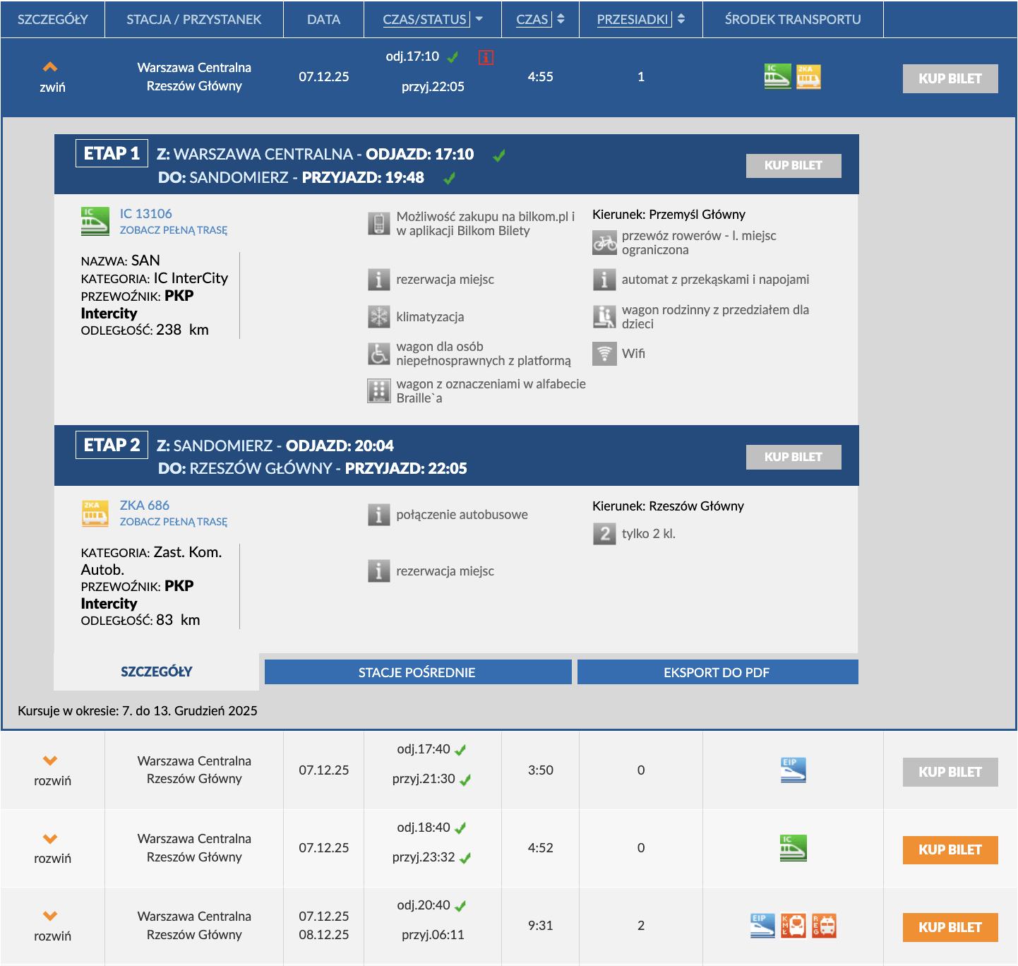 Jak wygląda teraz podróż, która miała być wizytówką kolei? Zamiast bezpośredniego pociągu, pasażerowie są skazani na tzw. Zastępczą Komunikację Autobusową (ZKA). Autobus zawozi podróżnych z Rzeszowa do Sandomierza, gdzie dopiero przesiadają się w pociąg. Efekt? Czas podróży wydłużył się do prawie 5 godzin (4:55), a komfort jazdy drastycznie spadł.