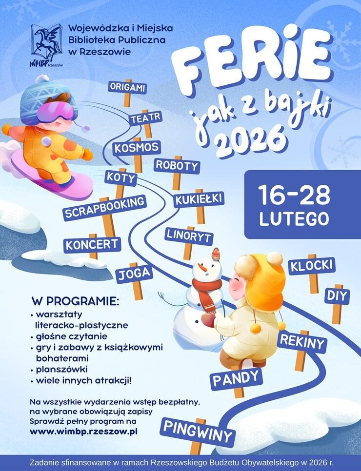 Dwa tygodnie, 54 wydarzenia i 19 placówek rozrzuconych na mapie całego miasta – Wojewódzka i Miejska Biblioteka Publiczna w Rzeszowie przygotowała ofertę, która rzuca wyzwanie nudzie. Program „Ferie jak z bajki 2026” to ambitny miks technologii, teatru i ekologii, finansowany z Rzeszowskiego Budżetu Obywatelskiego.