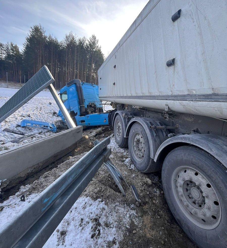 Kabina ciężarówki została mocno zdemolowana, wyrwany zderzak, zniszczona maska i popękana przednia szyba. Pojazd ugrzązł głęboko w błocie i śniegu, niszcząc po drodze infrastrukturę drogową.