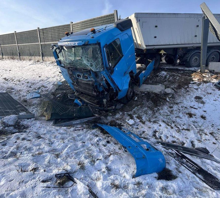 Kabina ciężarówki została mocno zdemolowana, wyrwany zderzak, zniszczona maska i popękana przednia szyba. Pojazd ugrzązł głęboko w błocie i śniegu, niszcząc po drodze infrastrukturę drogową.