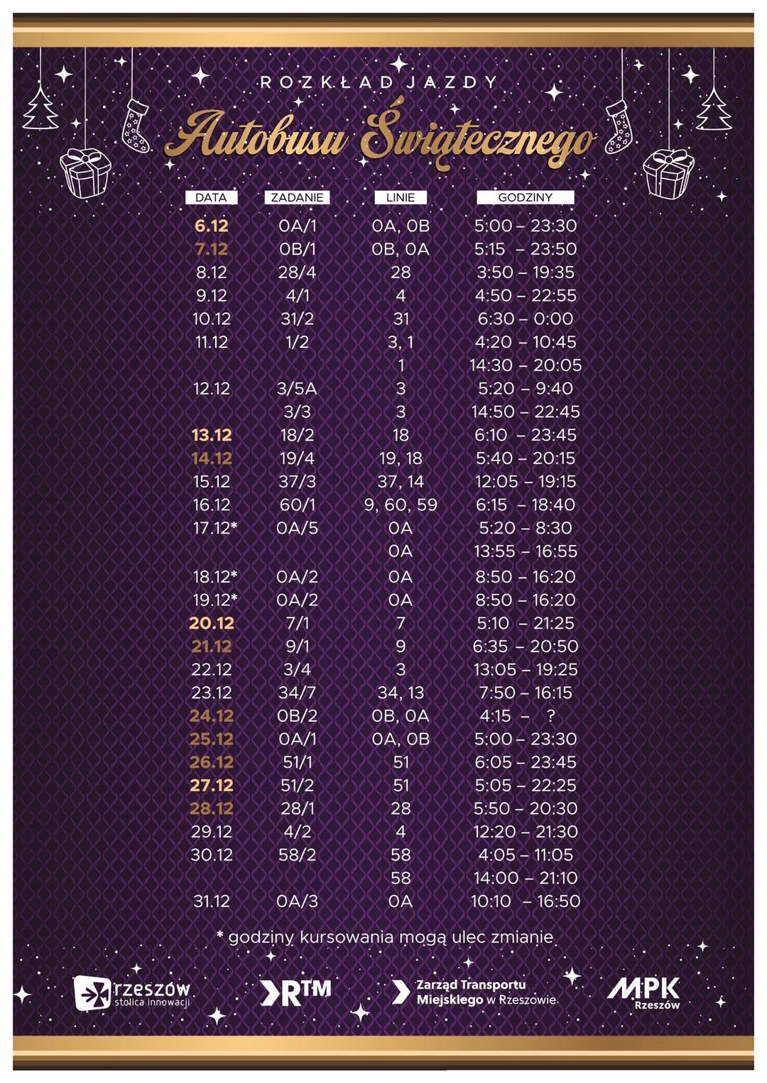 - linia 51: 26 i 27 grudnia. Pełny harmonogram obejmuje kursy od wczesnych godzin porannych (nawet od 3:50 rano) do późnej nocy.