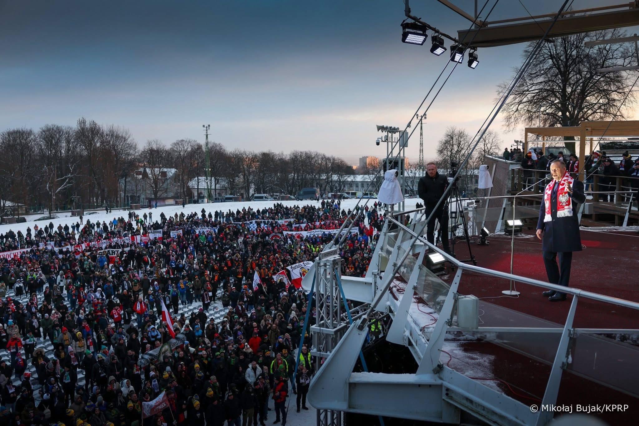 – Nikt nie powstrzyma gorących polskich serc, aby być dzisiaj tutaj i pokazać, że tak bardzo kochamy Polskę. Przyjeżdżałem tu jako pracownik IPN, jako historyk, a dziś stoję przed Wami jako Prezydent, ale wciąż czuję się jednym z Was. Dziękuję, że stadionów nie dotknęła propaganda i ideologiczne mody – mówił prezydent, za co otrzymał od kibiców specjalny, okolicznościowy szalik.