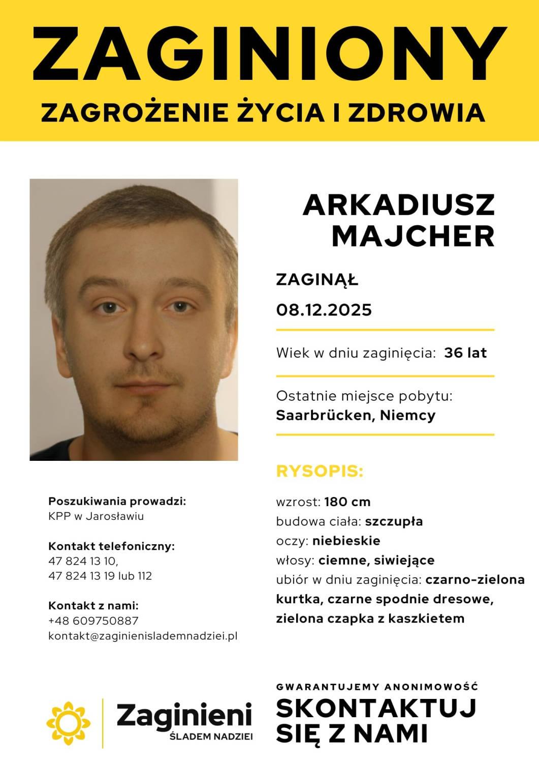 Osoby, które widziały Arkadiusza Majchera, przebywały z nim w autokarze lub posiadają jakiekolwiek informacje mogące pomóc w ustaleniu jego miejsca pobytu, proszone są o niezwłoczny kontakt z Komendą Powiatową Policji w Jarosławiu pod numerami telefonów: 47 824 13 10 lub 47 824 13 19. W sytuacji zagrożenia życia należy dzwonić pod numer alarmowy 112. Możliwy jest również kontakt mailowy z policją lub przekazanie informacji anonimowo.