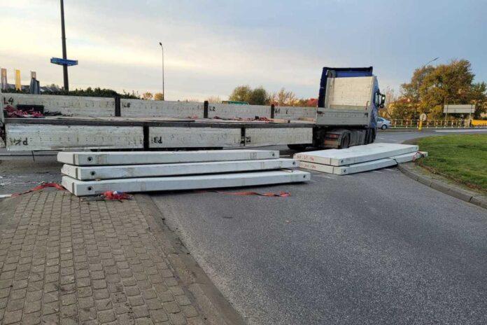 Kierujący ciężarowym volvo nie zabezpieczył ładunku w wystarczający sposób, co doprowadziło do zsunięcia się ciężkich betonowych elementów na jezdnię.