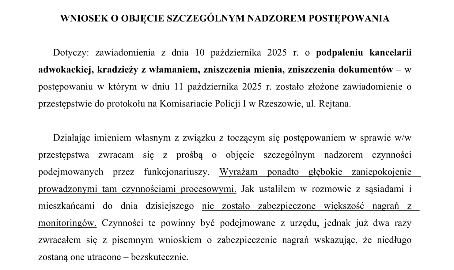 Na początku października w jednej z rzeszowskich kancelarii adwokackich nieznany sprawca metodycznie i ze spokojem rozlał łatwopalną ciecz, doprowadzając do podpalenia pomieszczeń. Rzeszowska policja, od października, jest bezradna w tej sprawie.